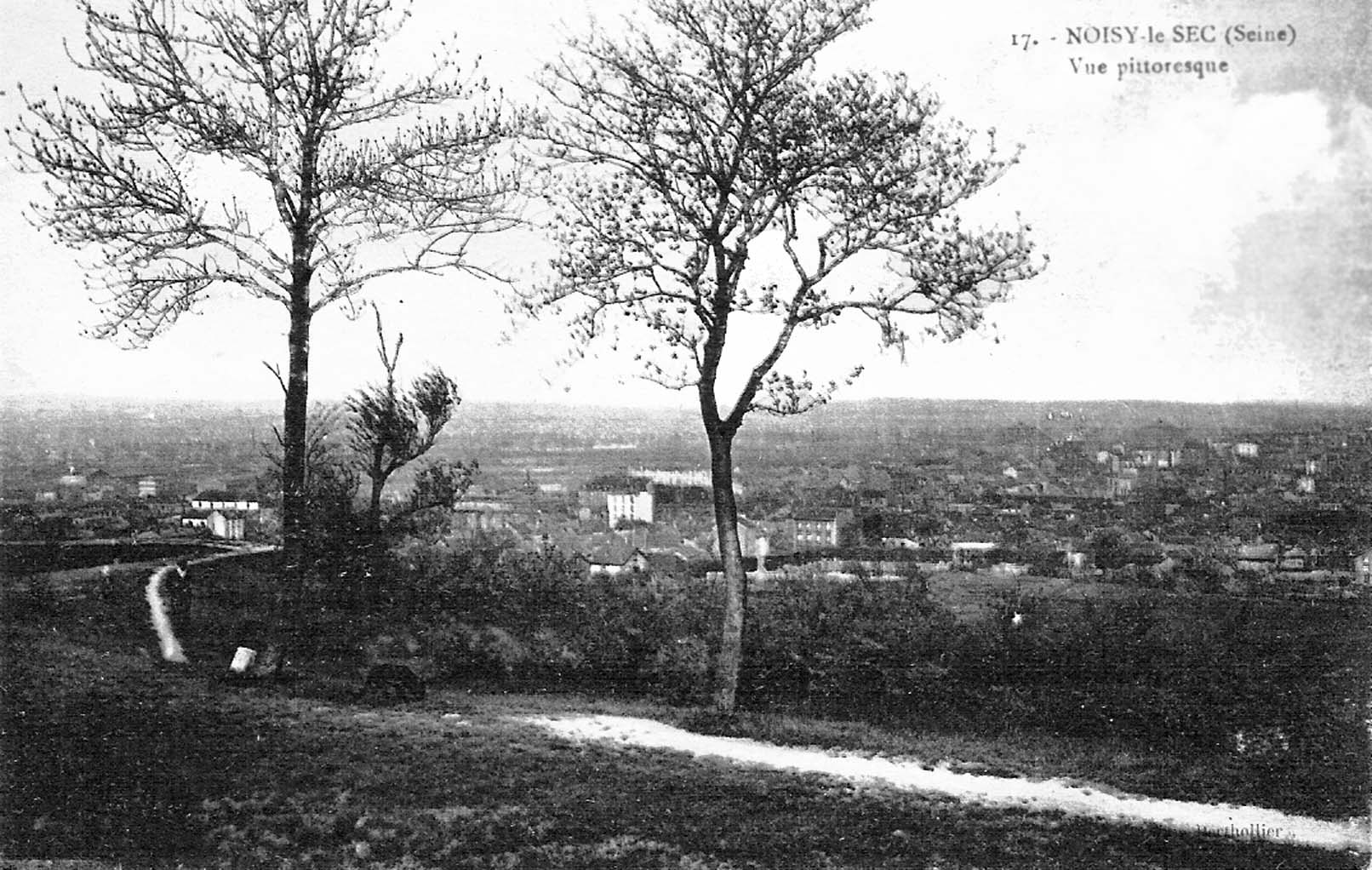 Les glacis du fort de Noisy-le-Sec sont un excellent belvédère d’où l’on découvre la plaine dont Noisy-le-Sec forme le premier plan. Une immense étendue se recule à l’extrême limite de l’horizon en « lointains vaporeux et bleuâtres » comme on écrivait au siècle de Mme Vigée Lebrun. Un fouillis charmant de jardins potagers, de cultures maraichères, d’arbres fruitiers, de petites barrières, de haies et de bosquets s’ingénie à vous faire oublier que les hommes de notre temps, s’ils restent encore par un atavisme indestructible de bons jardiniers, sont par contre devenus de piètres architectes. Le noyau du village se trouve non loin de là au bas de la pente que descend le boulevard de Montreuil après qu’il a dépassé une de ces carrières de plâtre dont l’ouverture aveuglante et béante nous renseigne sur la formation du sol.