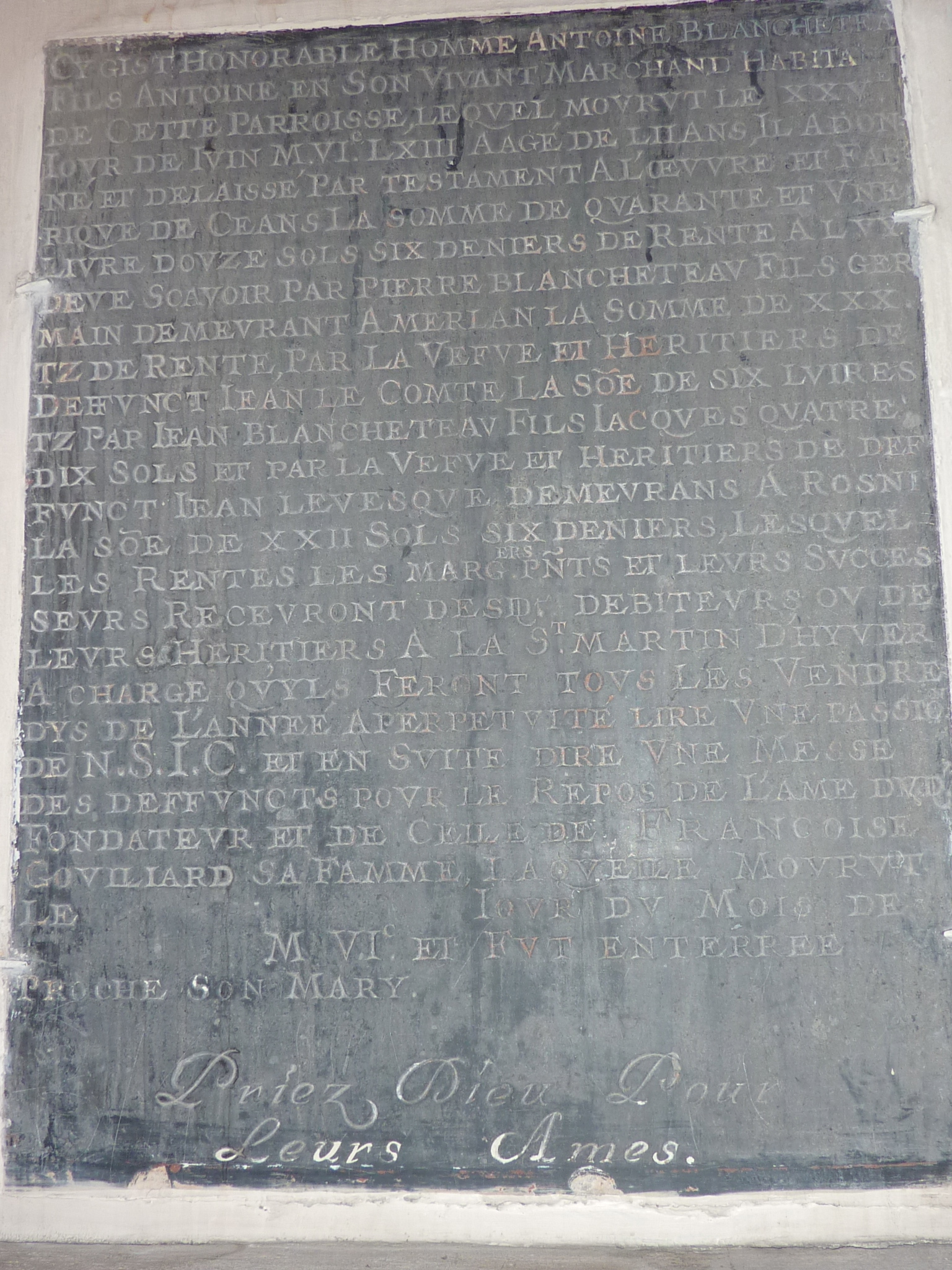 L’intérieur de l’église ne contient rien d’autre à signaler qu’une dalle de pierre dans laquelle sont gravés les termes d’une fondation pieuse en vertu de quoi, en l’année 1663, Antoine Blancheteau, marchand, lègue à la fabrique de la paroisse une rente de quarante et une livres douze sous six deniers à la charge pour les marguilliers de faire dire, chaque vendredi de l’année, un récit de la Passion. Le plus amusant de l’affaire, ce n’est pas tant cette donation, qui n’a rien que d’assez banal, que se modalités. Elles témoignent chez le donateur d’un sens de l’humour assez féroce. En effet, la somme en question lui était due, en parts inégales, par divers habitants du village et des environs : Pierre Blancheteau demeurant à Merlan , hameau de Noisy-le-Sec, la veuve de Jean Lecomte et celle de Jean Levêque , demeurant à Rosny. Si bien que tout en se donnant les gants d’être un homme généreux, le sieur Antoine Blancheteau trouve le moyen d’humilier pour l’éternité ses malheureux débiteurs. On n’est pas plus insolent !