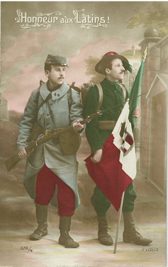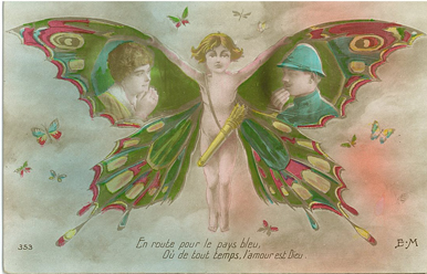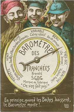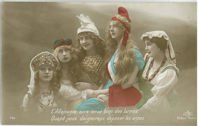 La carte postale était un lien important entre les familles et les poilus. De nombreuses séries de cartes furent imprimées sur les thèmes de la patrie, de la victoire, de la revanche… et des moqueries envers l’ennemi allemand. Les mises en scène étaient théâtrales : monstre à casque à pointe, alsacienne attachée au poteau de torture, … On opposait à la barbarie allemande, la générosité française.