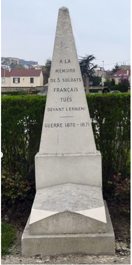 Sur le monument on lit l’inscription « A la mémoire de cinq soldats Français tués devant l’ennemi Guerre de 1870-1871 ». Ce monument a été transféré au nouveau cimetière en 1952 lors du regroupement des tombes militaires.