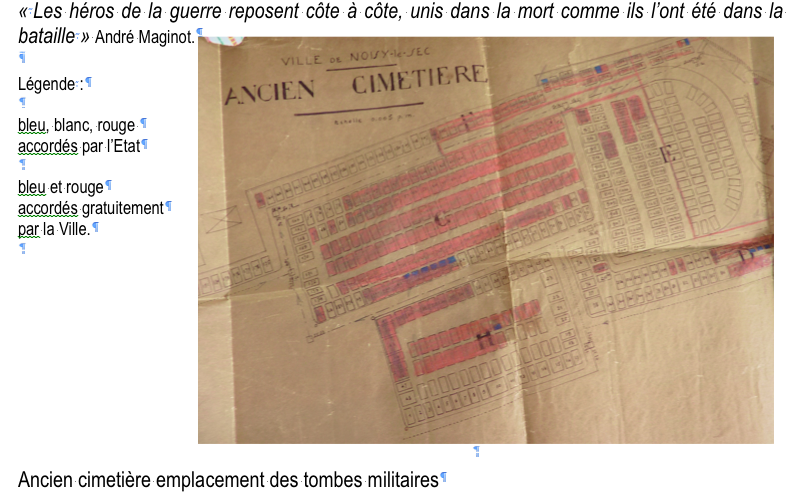 Délibération du Conseil Municipal en date du 30 novembre 1951 : « Il (Monsieur le Maire) a attiré l’attention de M. Le Ministre des Anciens Combattants sur la nécessité de procéder au regroupement à l’ancien cimetière de 76 tombes militaires d’Etat de la guerre 1914-1918. (…) que par sa lettre du 7 septembre 1951, M. le Ministre lui a fait connaître que le regroupement (…) ne pouvait être envisagé à l’ancien cimetière, mais qu’il était souhaitable de transférer les tombes au Nouveau cimetière. L’emplacement retenu, se trouve dans le carré des victimes de guerre en arrière des tombes existantes. »