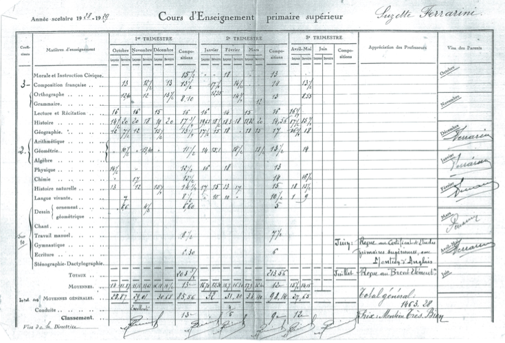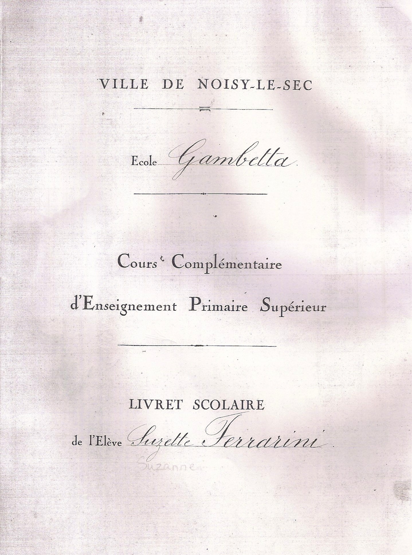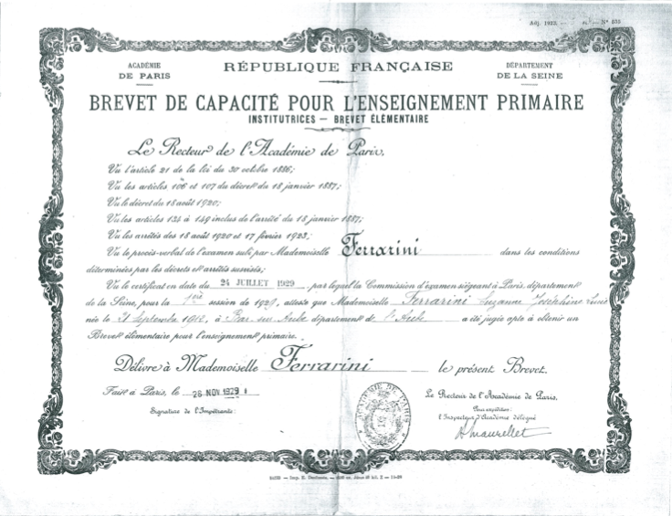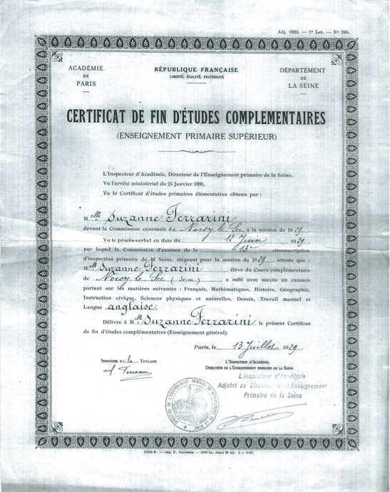 Le Certificat d’Etudes Complémentaires, passé par Suzanne Ferrarini à 16 ans, en juin 1929, sanctionne ses études au Cours Complémentaire du Boulevard Gambetta à Noisy-le-Sec, et fait mention d’une épreuve optionnelle, l’anglais. La même année, en juillet, elle passera le Brevet Elémentaire.