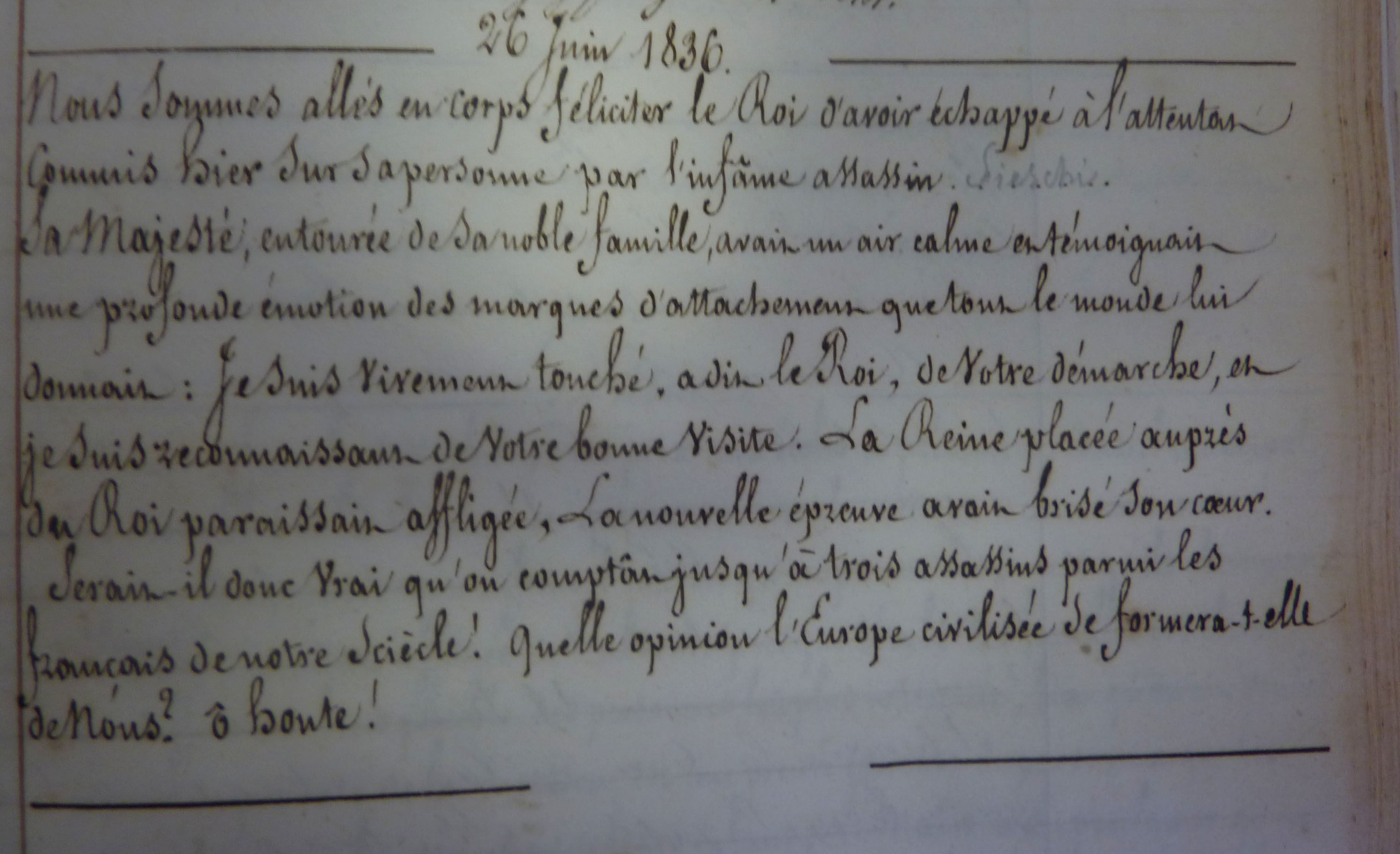 « Nous sommes allés en corps féliciter le Roi d’avoir échappé à l’attentat commis hier sur sa personne par l’infâme assassin.