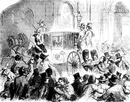 Louis-Philippe, la reine Marie-Amélie et Madame Adélaïde quittent le palais des Tuileries. Ils ont pris place dans une voiture blindée appelée « la Saverne », qui servait à Napoléon 1er et qui a été remise en service depuis l’attentat de Fieschi. Comme à son habitude, mais contrairement à l’étiquette, le roi a laissé les deux places dans le sens de la marche à sa femme et à sa sœur et s’est installé à contresens sur la banquette qui leur fait face.